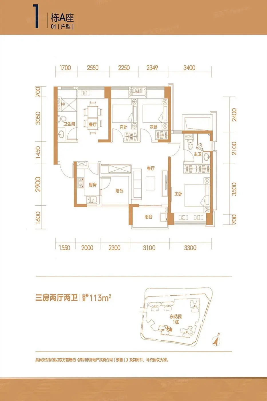 1栋A座01户型 3室2厅1厨2卫 113.00㎡